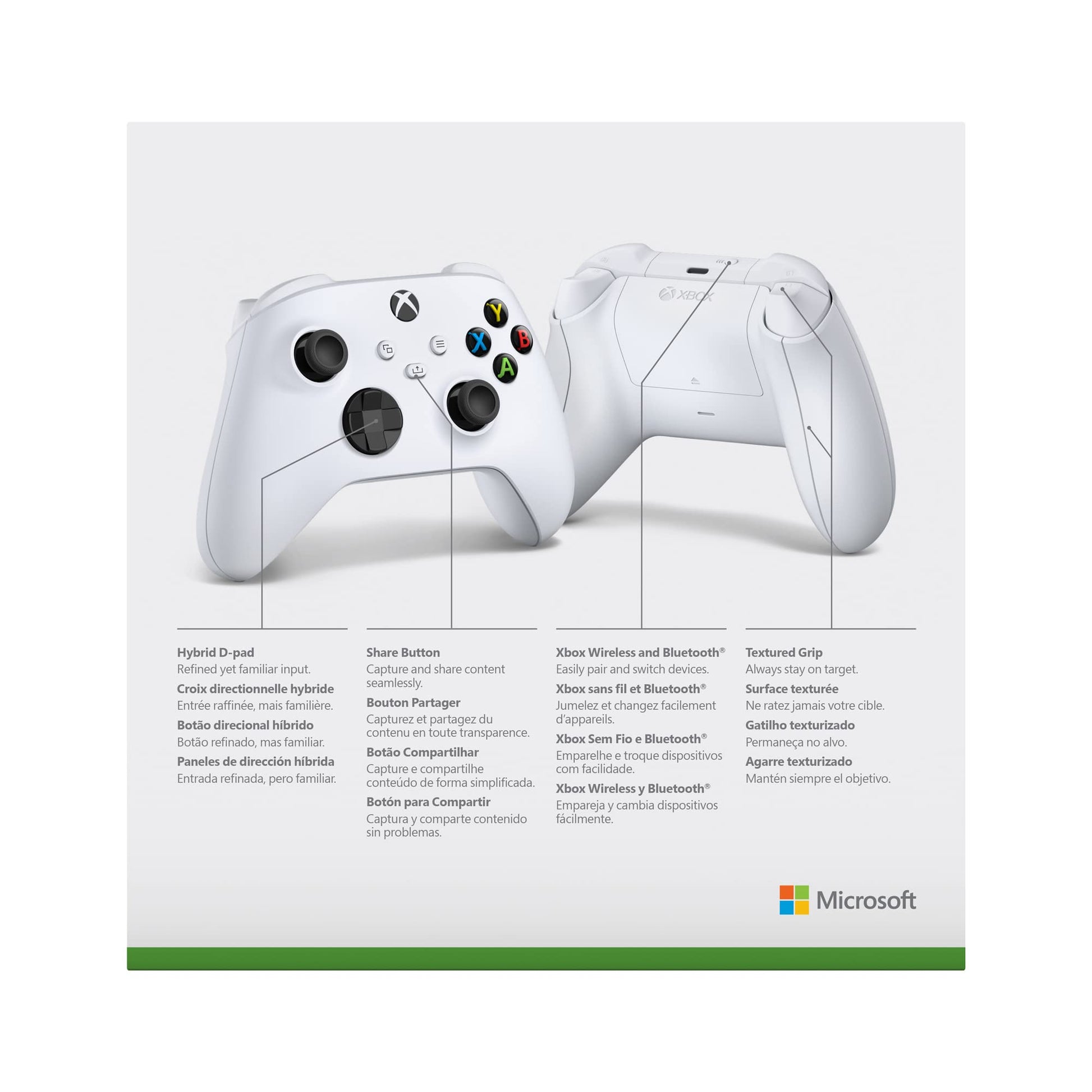 • Stay on target with textured grip on the triggers, bumpers, and back case and with a new hybrid D-pad for accurate, yet familiar input.